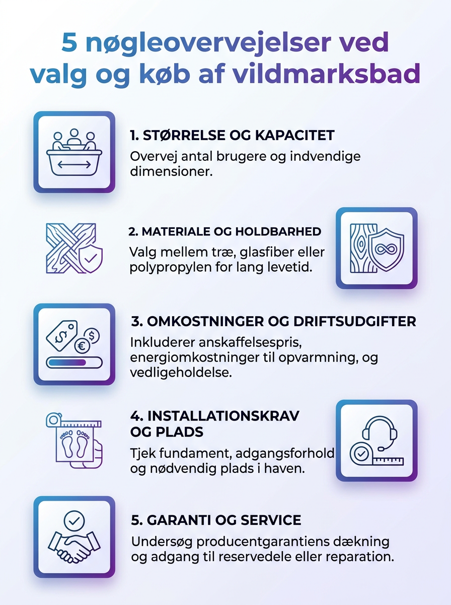 Valg og køb af vildmarksbad handler først og fremmest om at finde den løsning der passer til din hverdag. Størrelse, opvarmning, materialer og tilbehør spiller alle en vigtig rolle.